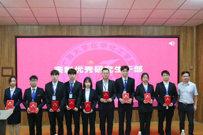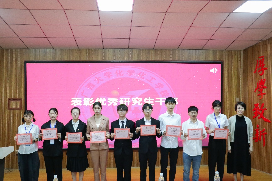 大会还进行表彰仪式。学院党委副书记、纪委书记刘丽和副院长江俊为我院第二十一届研究生会主席团成员和各部门负责人以及优秀学生干部颁发聘书和荣誉证书,同时合影留念。