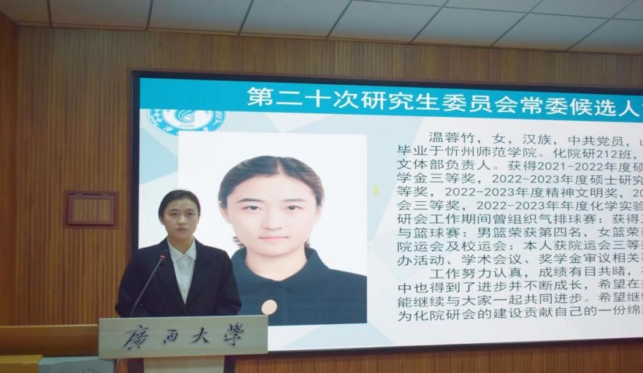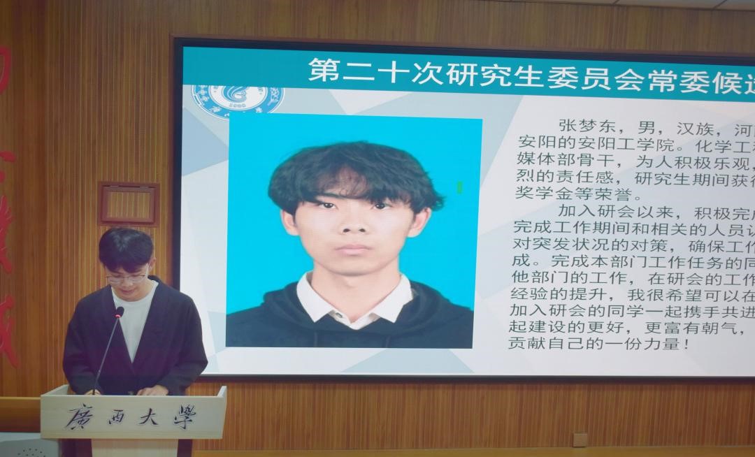接着是第二十届研究生会主席团候选人的竞选演讲。候选人们充分表述了自己竞选的职务及自身的优势,展示了他们愿为同学和研究生会服务的意愿。