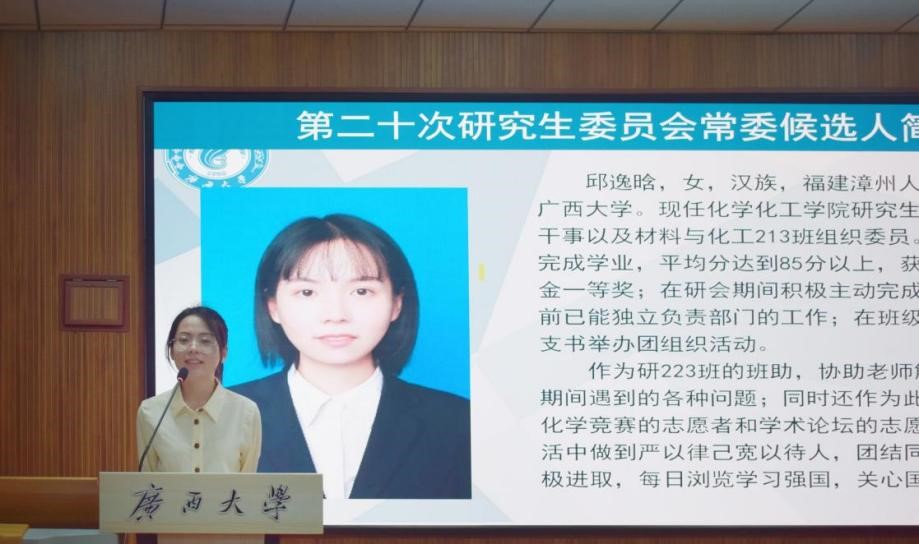 广西大学研究生会主席团成员陈力源在开幕式上致辞。陈力源高度肯定了我院研究生会过去一年的工作,并对大会召开表示祝贺。