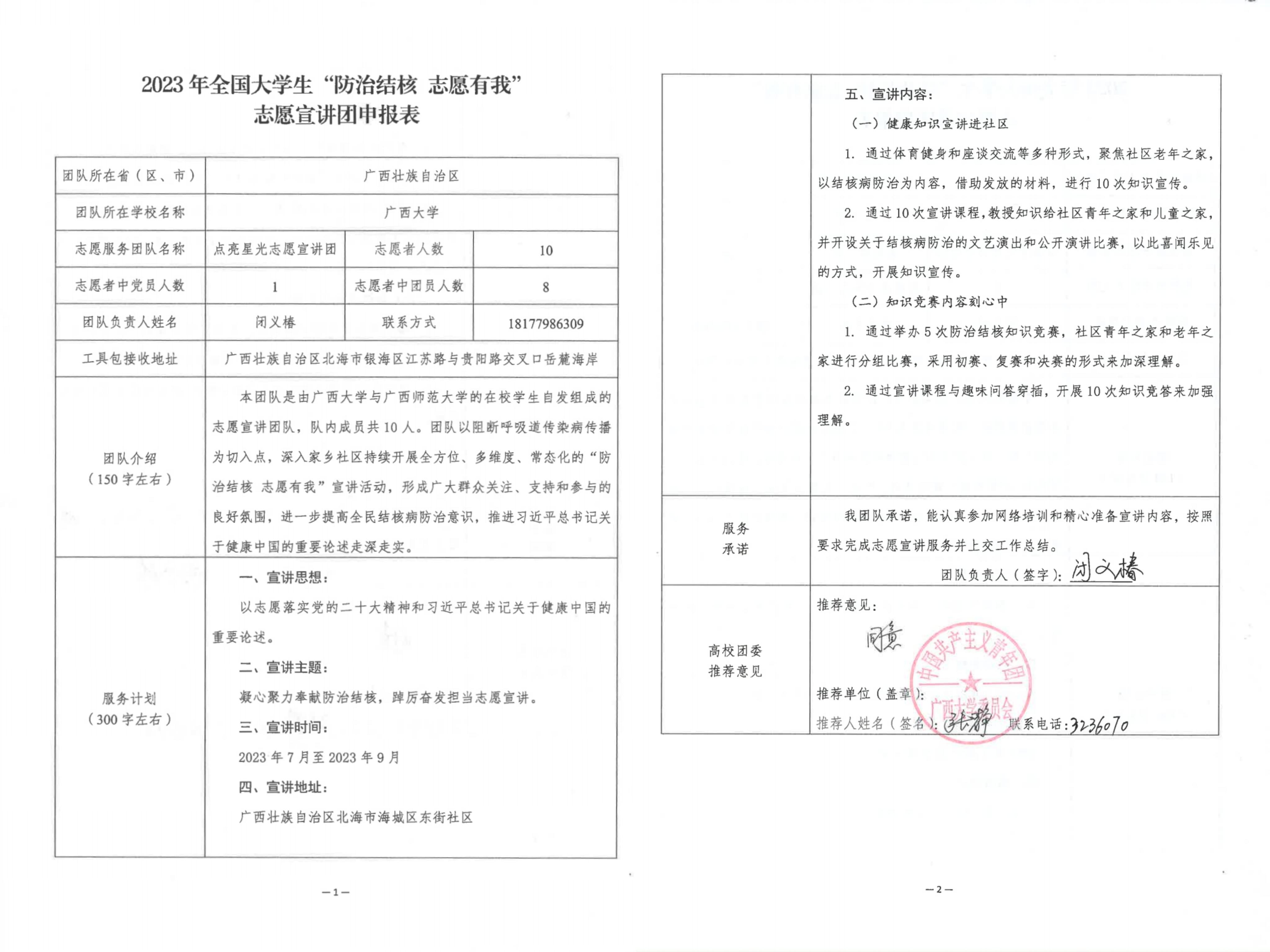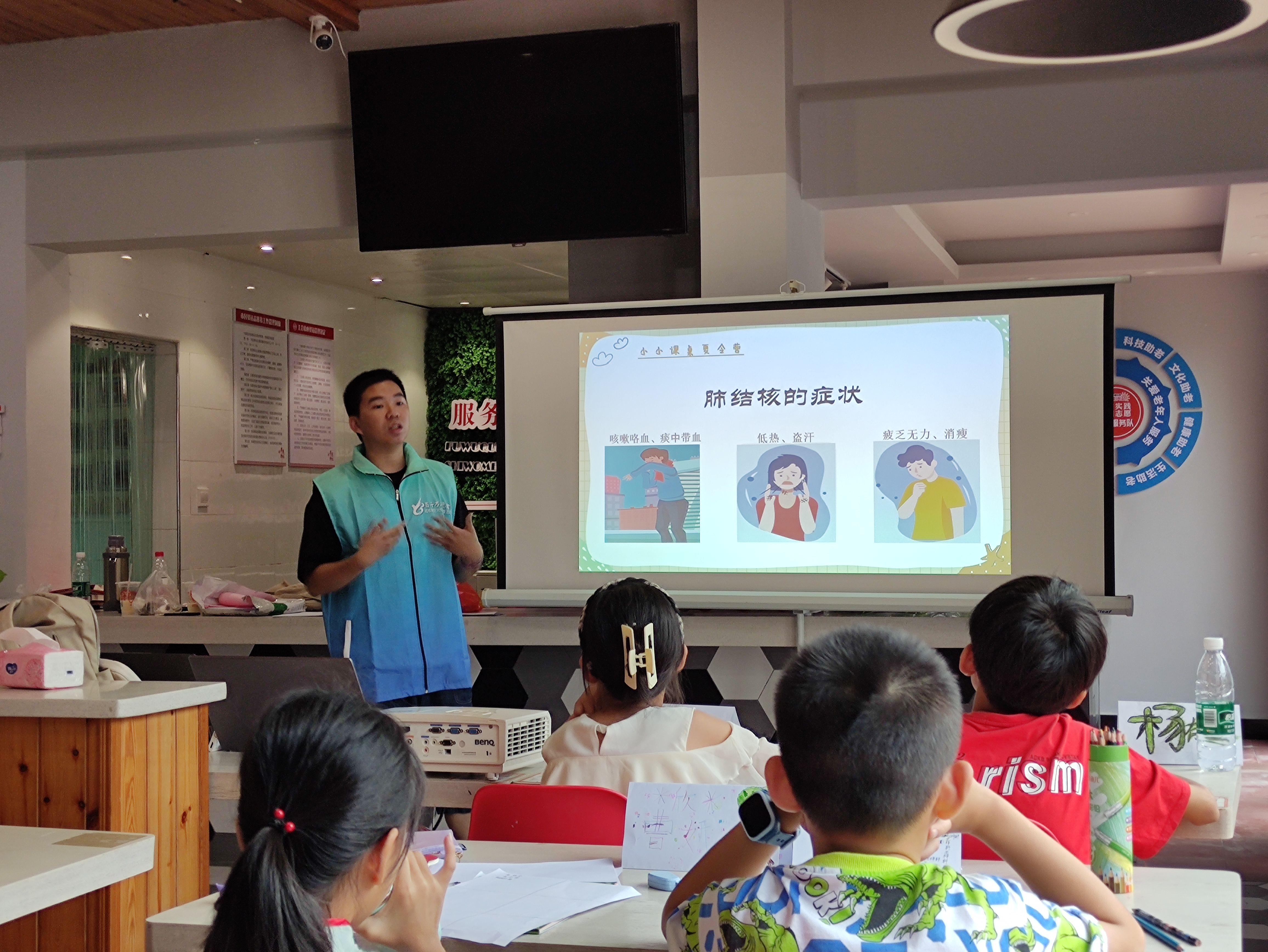 为深入学习宣传党的二十大精神,贯彻落实习近平总书记关于健康中国的重要论述和“从源头上预防和控制重大疾病”的重要指示,2023年7月26日-8月16日,广西大学化学化工学院闭义椿与来自广西大学、广西师范大学的10名在读本科生返家乡组成“点亮星光”志愿宣讲团,协同广西壮族自治区北海市海城区东街团委,面向社区儿童、青少年有针对性地开展以“防治结核”为宣讲主题的“小小课桌夏令营”暑期社区志愿服务活动。