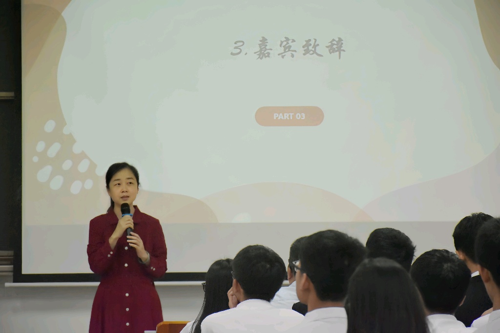 大会伊始,主持人梁健林、杨雅媛介绍了本次大会的流程和到场嘉宾,拉开了本次大会的序幕。首先,由张静老师作为嘉宾代表致辞。张老师对参会成员的到来表示热烈欢迎,并从以下方面勉励各位同学:一是学生会成员应该学会自己管理自己,二是学生会要做好老师的帮手,以及老师和同学之间的桥梁,三是希望各位新成员可以向优秀学长学姐学习如何协调好工作和学习的关系。