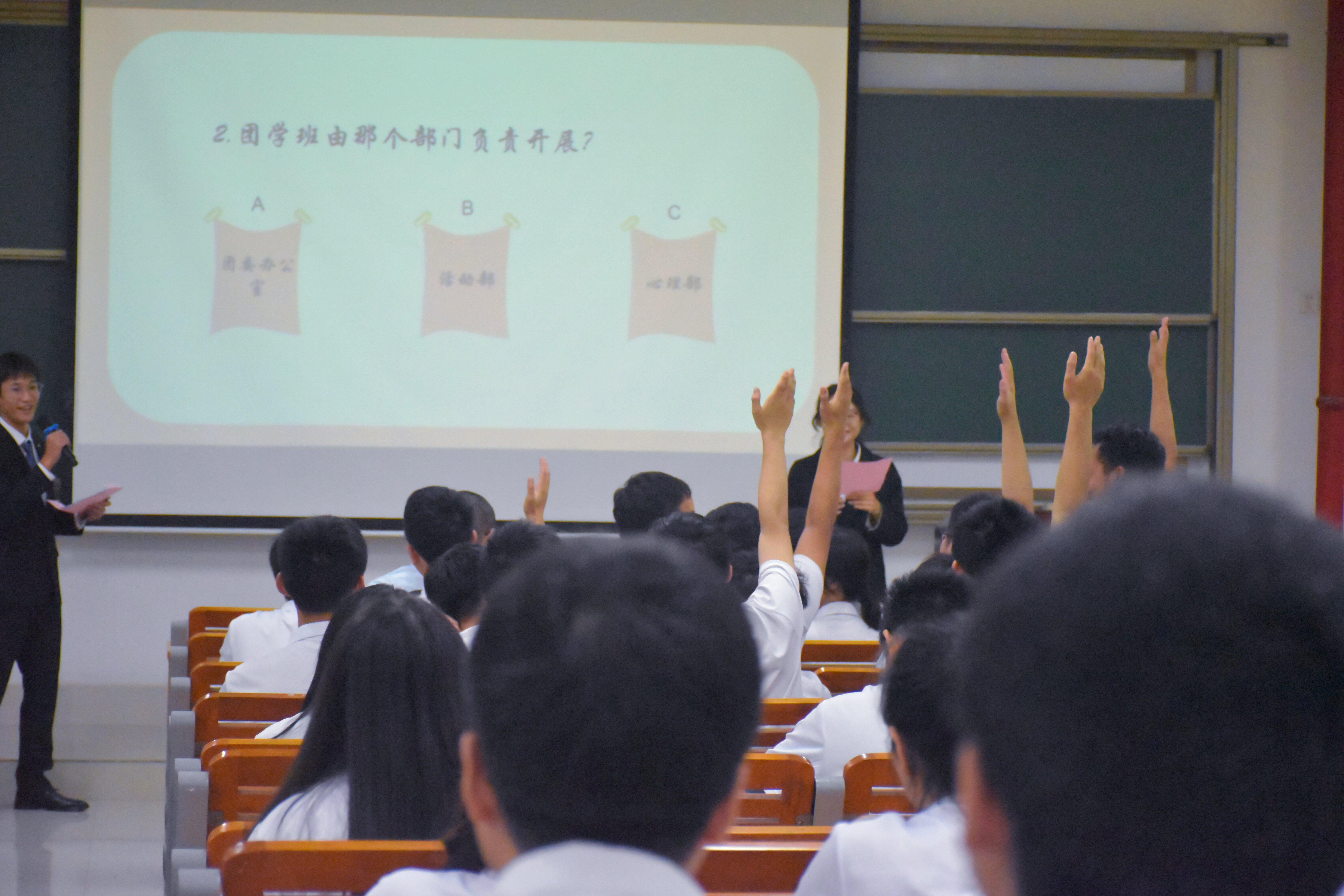 主持人先后介绍了主席团成员谢曼、苏霞以及秘书长欧芷彤。接着,团委学生会各部门以ppt的形式对部门进行一个简短的介绍,此环节主要讲述了各部门的工作与特点。台下同学认真聆听,在其后的有奖竞答环节中,同学们积极举手,踊跃回答,正确率高达100%。