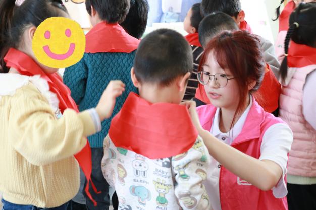 我院志愿者代表们充分发扬了雷锋精神,为即将踏入小学校园的小朋友们亲手系上鲜艳的红领巾。“领巾披上肩、对齐两个尖……”,在现场不断重复地口诀中,志愿者们一遍又一遍认真地教导小朋友们学习佩戴红领巾的步骤,在志愿者的带领下,小朋友们学会了如何自己佩戴红领巾,并开心展示。