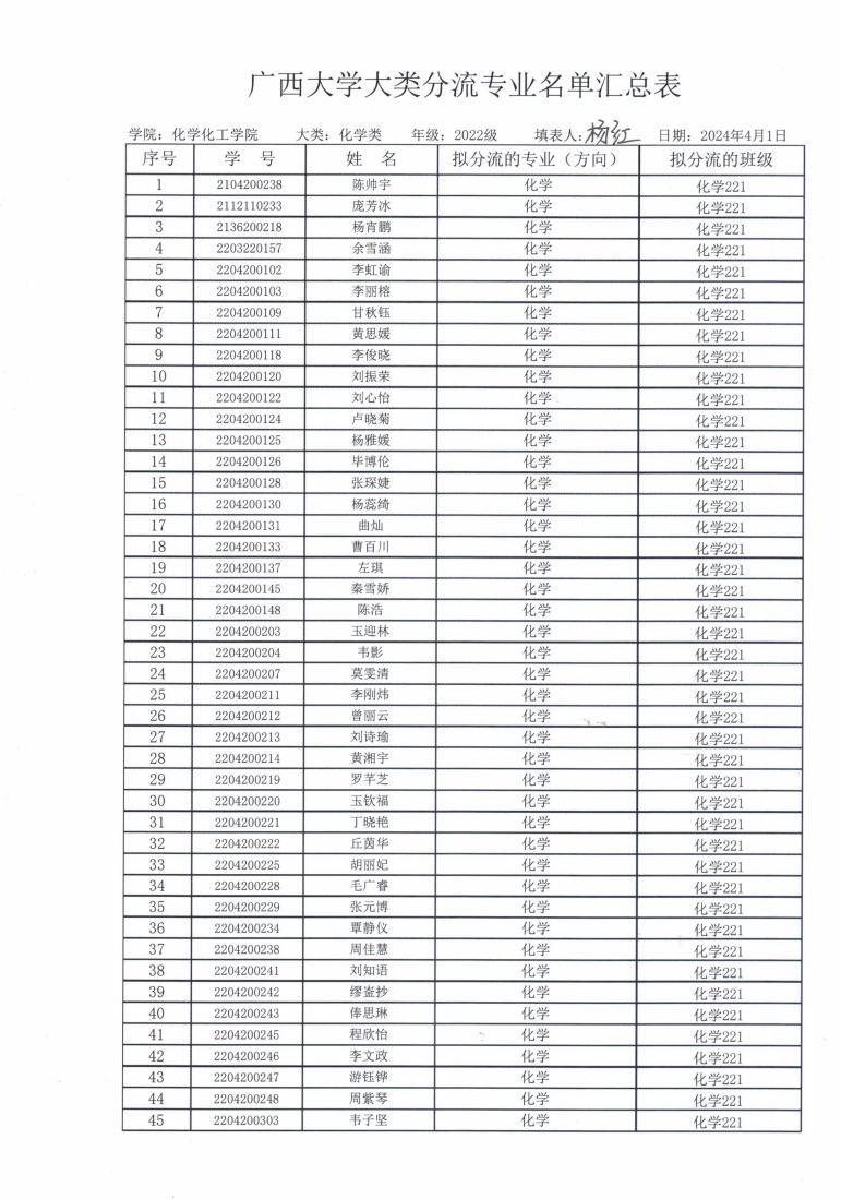 化学化工学院2022级化学类大类分流专业名单汇总表(化学专业)
