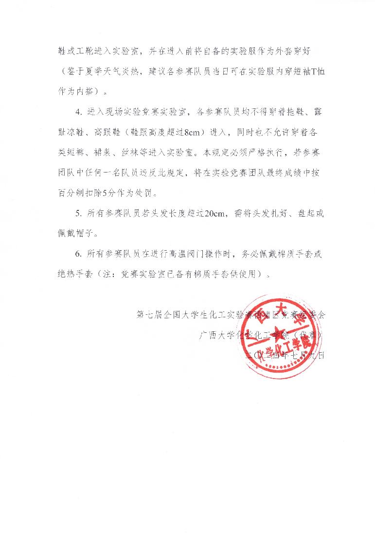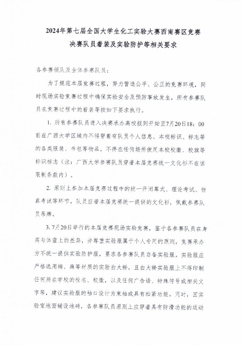 2024年第七届全国大学生化工实验大赛西南赛区决赛队员着装及实验防护等相关要求