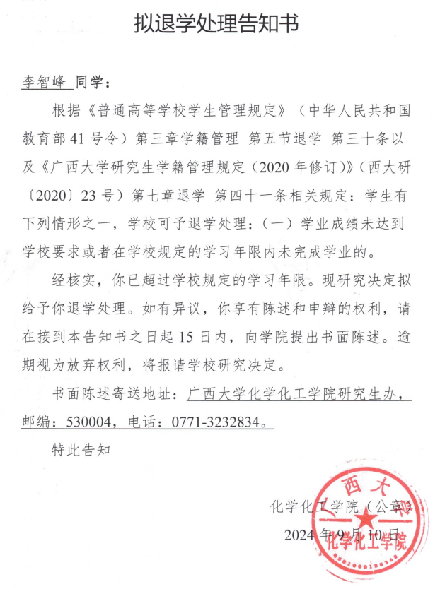 关于2019级硕士研究生李智峰超学习年限拟退学处理公示