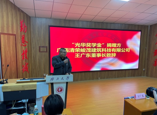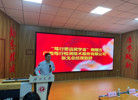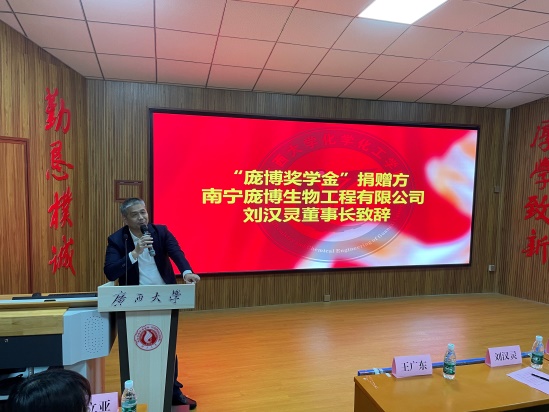 为探索校企合作新模式,推动产学研协同创新。 2024年1月11日,2023年度化学化工学院校友奖学金颁奖仪式暨企业宣讲会在化学化工学院举行。广西大学校友工作办公室周海斌主任、“广西大学庞博奖学金“捐赠方代表刘汉灵校友、”笃行思远奖学金“捐赠方代表张戈校友、“光华奖学金”捐赠方代表王广东校友分别致辞,化学化工学院党委书记、院长周立亚做总结发言,尹诗斌副院长主持会议。获得奖学金的同学和学院教师代表参加了颁奖仪式。