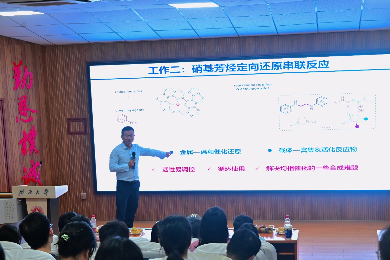 张珉教授在汇报中详细介绍了其课题组创新性地利用“定向还原”策略高效地实现含氮杂环类化合物官能化的一系列研究成果,其中包括“氢转移还原偶联”、“电化学还原偶联”和“非均相催化还原偶联”等精彩内容。