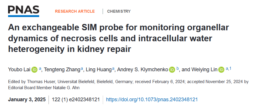 近期,我校化学化工学院探针与化学生物学团队在超高分辨探针领域取得了重要科研突破。该团队的最新成果以“An exchangeable SIM probe for monitoring organellar dynamics of necrosis cells and intracellular water heterogeneity in kidney repair(可交换超高分辨探针用于监测坏死细胞的细胞器动力学和肾脏修复中细胞内水的异质性)”为题发表在国际顶级综合性学术期刊《美国科学院院刊》(Proceedings of the National Academy of Sciences of the United States of America, PNAS)。论文的第一作者为化学化工学院博士研究生赖有博,唯一通讯作者为林伟英教授,广西大学为该论文的第一通讯单位。
