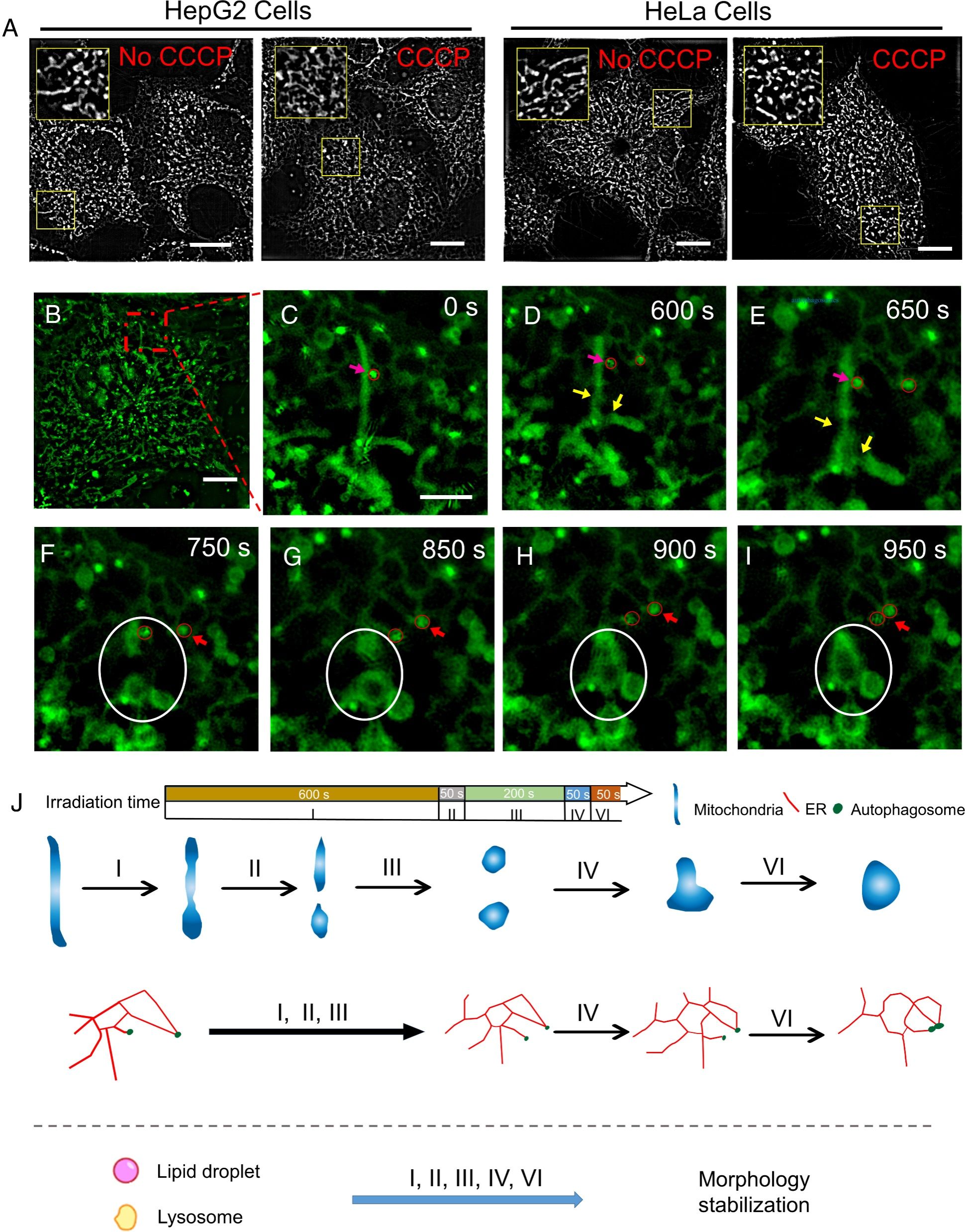 基于上述背景,该团队提出了一种合理的探针设计策略,旨在实现超高分辨率成像,并成功研发出新型可交换脂质探针APBD。APBD具有优异的光稳定性、免水洗性、高荧光亮度以及良好的生物相容性。研究结果表明,基于新型探针APBD的超高分辨率显微成像技术能够长时间动态观察细胞坏死过程,并揭示了线粒体在这一过程中经历肿胀、分裂和融合的三个重要阶段,同时伴随着内质网的破裂。值得注意的是,破裂的内质网通过内质网小管末端的自噬体进行重建,而其他细胞器则维持相对稳定。因此,实验结果表明,线粒体在细胞坏死过程中起着至关重要的作用。