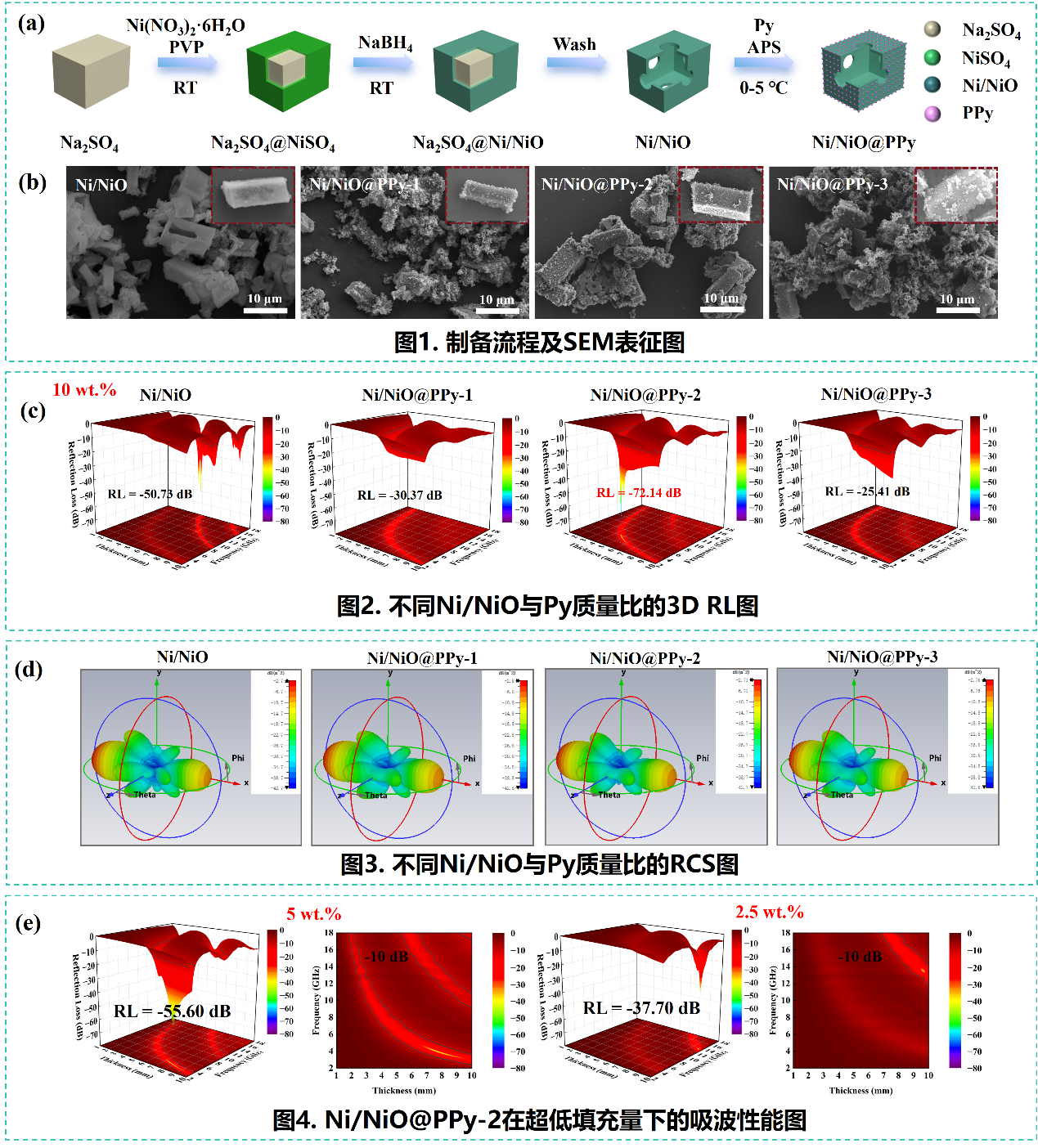 团队研究了不同Ni/NiO与Py质量比的复合膜的微波吸收性能,通过CST Studio Suite 2024 软件对所制备的一系列Ni/NiO@PPy材料进行了雷达散射截面仿真,并进一步研究了在超低填充量下,Ni/NiO@PPy复合膜的微波吸收性能。