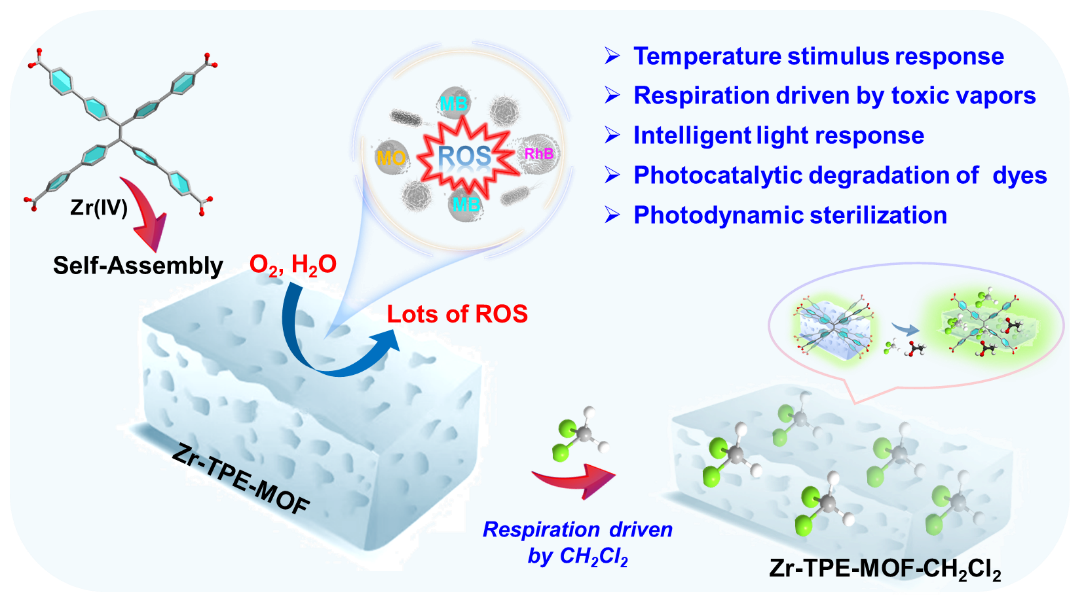 我院研究团队选取了最常见的四苯基乙烯母核且分子转子结构延长(相对于H4TCPE)的H4TPPE作为连接子,八面体状的Zr6O4(OH)8(H2O)4团簇作为次级构建单元(SBUs),组装了一例能够由CH2Cl2或CH3COOH蒸气驱动呼吸作用的智能发光MOF(Zr-TPE-MOF)。Zr-TPE-MOF能够通过呼吸作用吸入微量的CH2Cl2或CH3COOH蒸气进入孔道内,引发发射波长的明显蓝移以及高达3倍的发射强度增加。此外,Zr-TPE-MOF在80 ~ 350 K的温度范围内的热致荧光变色行为并不明显,而在350 ~ 470 K的温度范围内且具有非常明显的热致荧光变色行为。同时,Zr-TPE-MOF对重金属离子Cr2O72−显示出了高灵敏且可视化的智能光响应行为,且检测限低至7.49 μM。得益于Zr-TPE-MOF的多孔框架结构及有机-无机杂化特性,其在低功率的光辐照条件下具有出色的I型ROS的生成能力,并且显示出了优异的光动力灭菌和快速降解有色染料的性能。