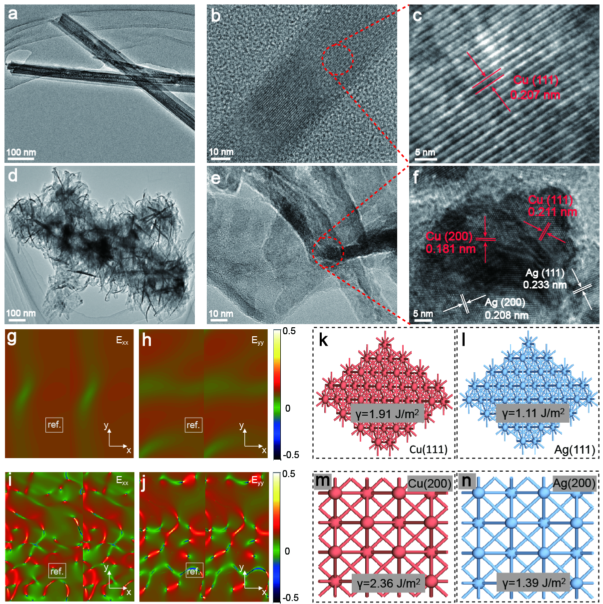 针对这一挑战,研究团队发展了一种相分离的铜银合金材料,该合金结构界面应力诱导的铜缺陷构型Cu@CuAg(200)-PS,可用于高效氮气电合成氨过程。通过理论计算结合高分辨率透射电子显微镜、X射线吸收近边结构和 X 射线吸收精细结构等表征技术,该团队进一步证实了具有丰富界面铜缺陷位点的相分离铜银合金界面可以有效地激活化学惰性氮气,从而可在常温环境下大幅提升氨电合成性能。