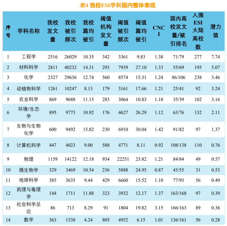 据统计,截止11月,化学学科发文量2327篇,被引频次29636次,篇均被引12.74次,阈值机构发文量560篇,阈值被引频次8574次,阈值篇均被引15.31次,CNCI值为1.24.国内高校发文量/被引排名:86/106。入围ESI大陆高校数238所,潜力值为3.46.