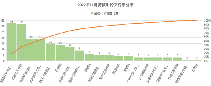 高被引论文数排名前三的学科领域依旧是材料学科(42篇、)工程学(41篇)和化学(29篇);分布在这三个学科领域的高被引论文数占比高达57.73%。其中化学化工学院(32篇)位居全校高被引论文数排行榜第二。