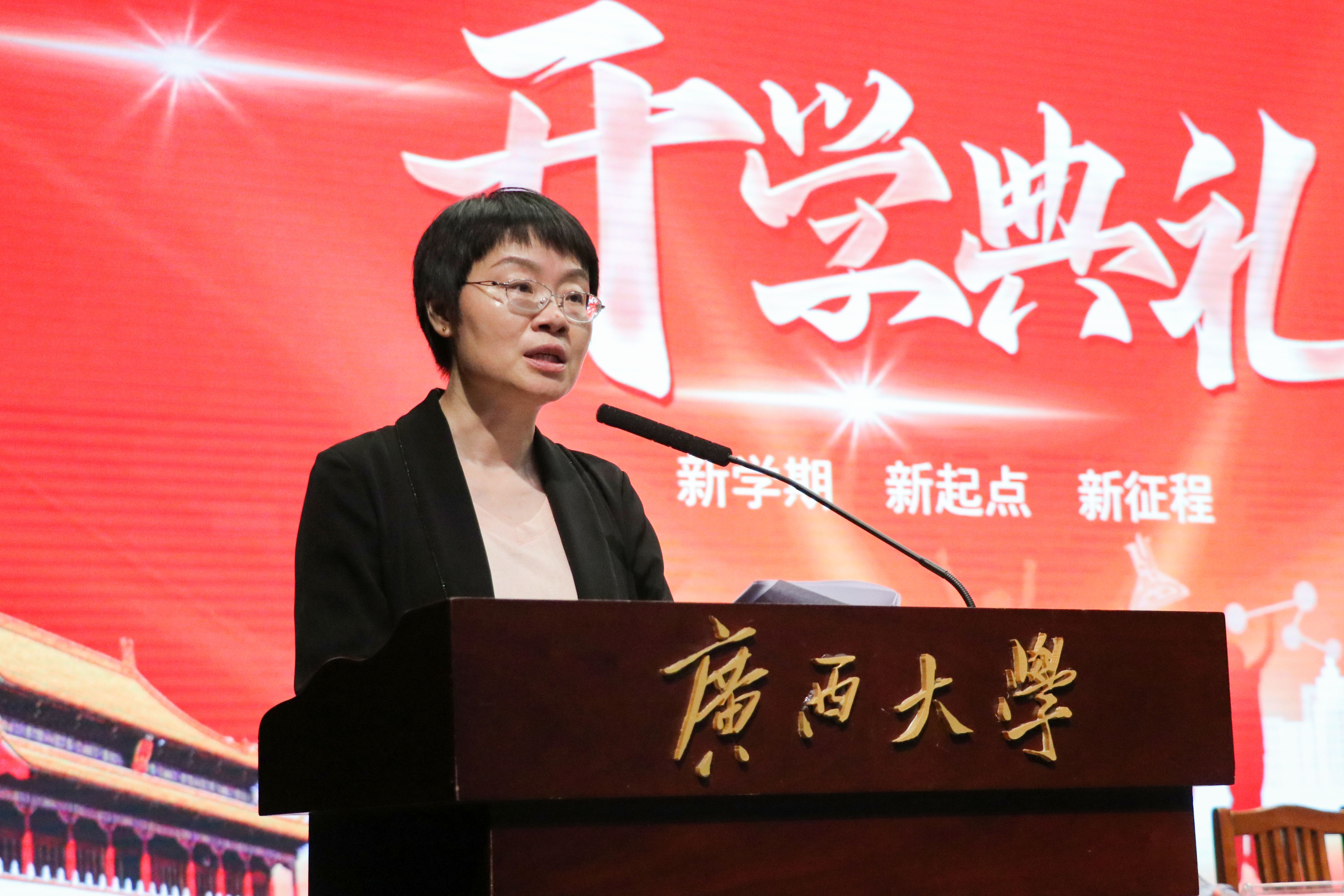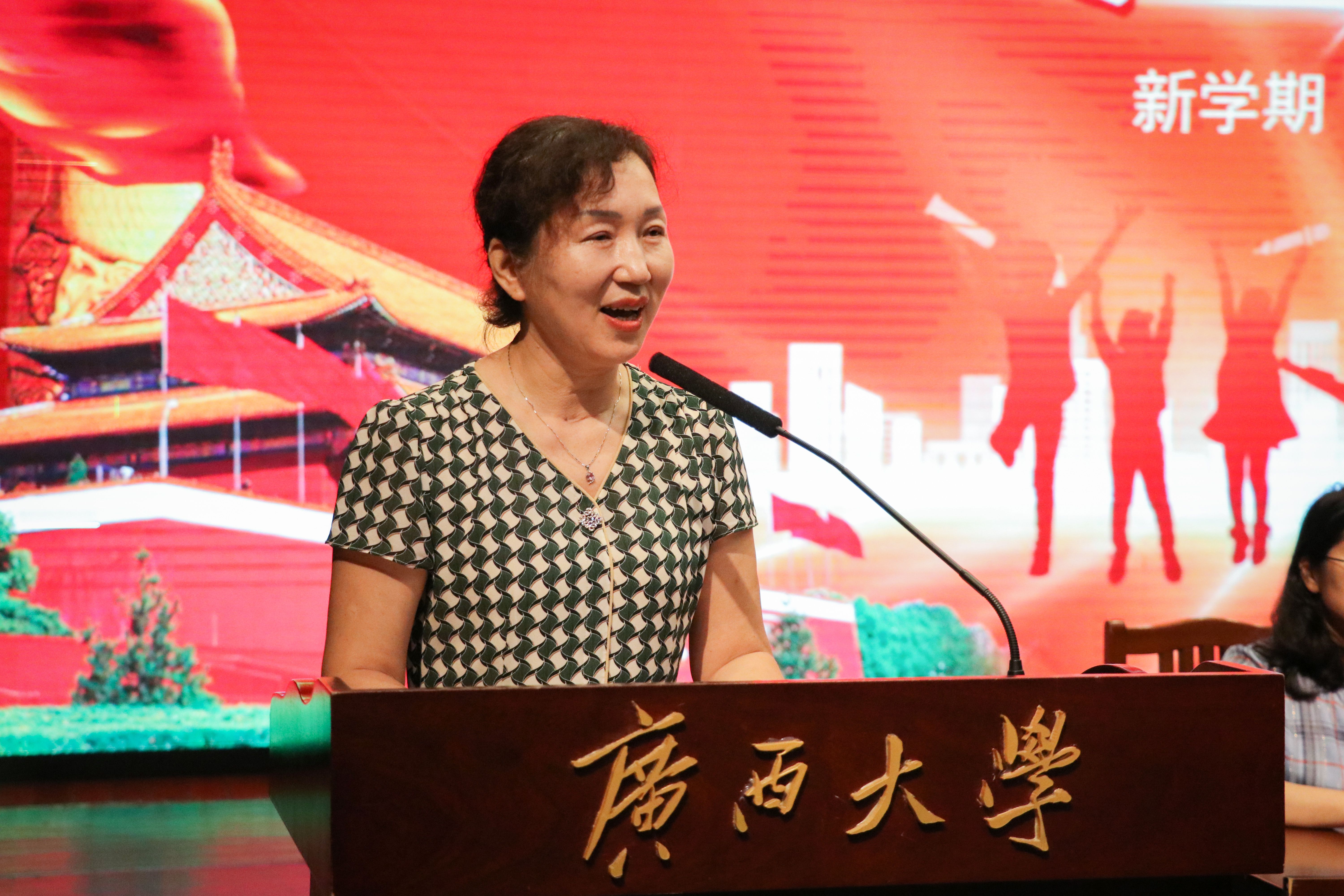 教师代表李志霞在发言中鼓励广大新生勤奋学习,刻苦钻研,不断追问、团结协作,互相勉励,勇于担当,服务社会,在奋斗中绽放绚丽之花。