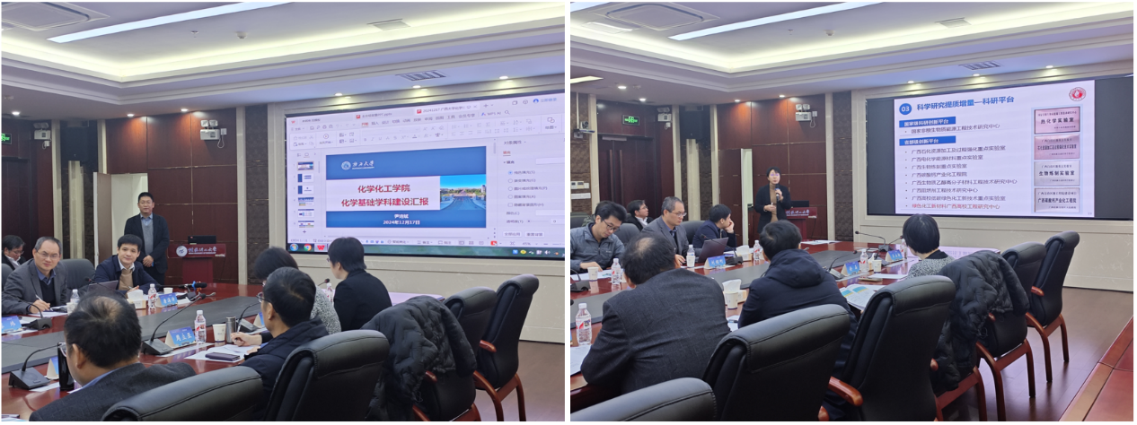 在会上,我院尹诗斌教授、徐晶教授和关安翔老师分别作《广西大学化学学科建设进展》、《广西大学化工学科建设进展》和《Cu基材料电催化转化CO2》的学术报告,分享学科建设经验和课题研究进展。
