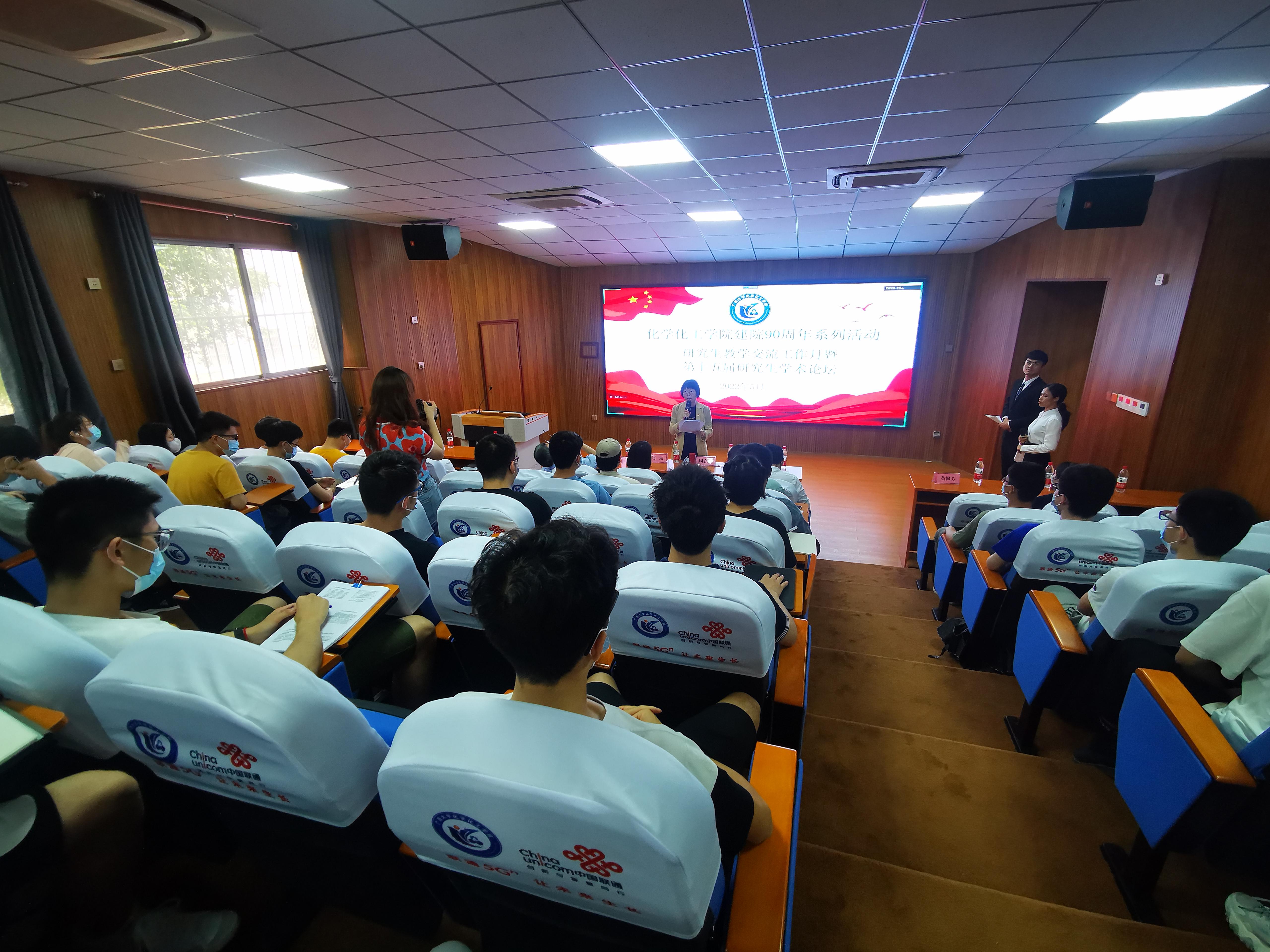 2022年5月11日,化学化工学院建院90周年系列之“研究生教学交流工作月暨第十五届研究生学术论坛”活动在学院一号楼报告厅举行。作为对学院90周年院庆的献礼,论坛向全院师生大力弘扬我校“创新创造,奋勇争先,全面一流”的“双一流”精神,聚焦前沿科学研究,续写学院崭新辉煌。