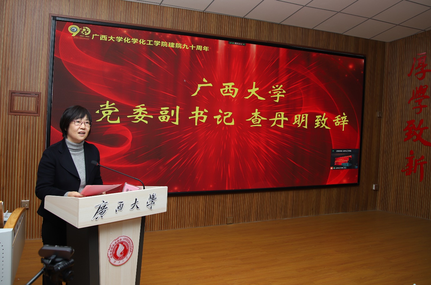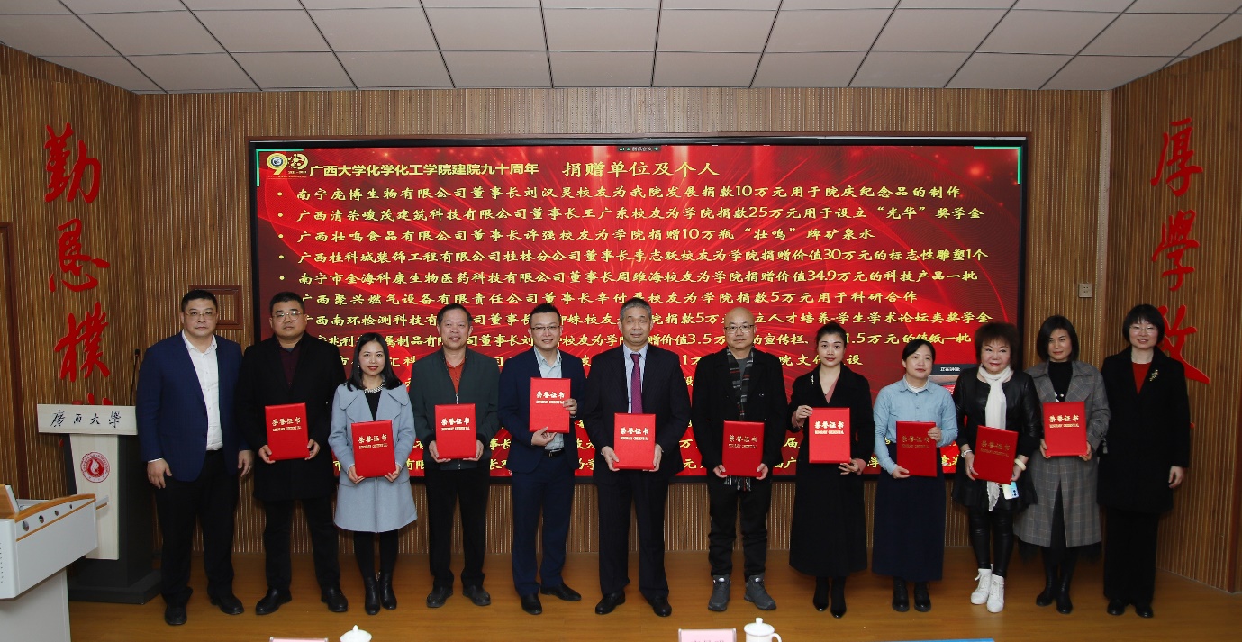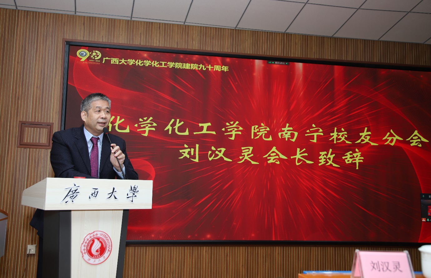 九十载沧桑砥砺,九十载春华秋实!广西大学化学化工学院12月10日下午在化院1号楼举行了隆重而简朴的建院90周年庆祝大会。会议以线下+线上形式同步举行,线下主会场有学院校友、院友、师生代表参会,同时设立了9个分会场,分别为学院柳州、南宁、桂林、梧州/贺州、百色、广东、钦州/北海/防城港、河池、京津冀校友分会会场,同步视频连线共庆学院九秩华诞。会议由化学化工学院党委书记、院长周立亚教授主持。