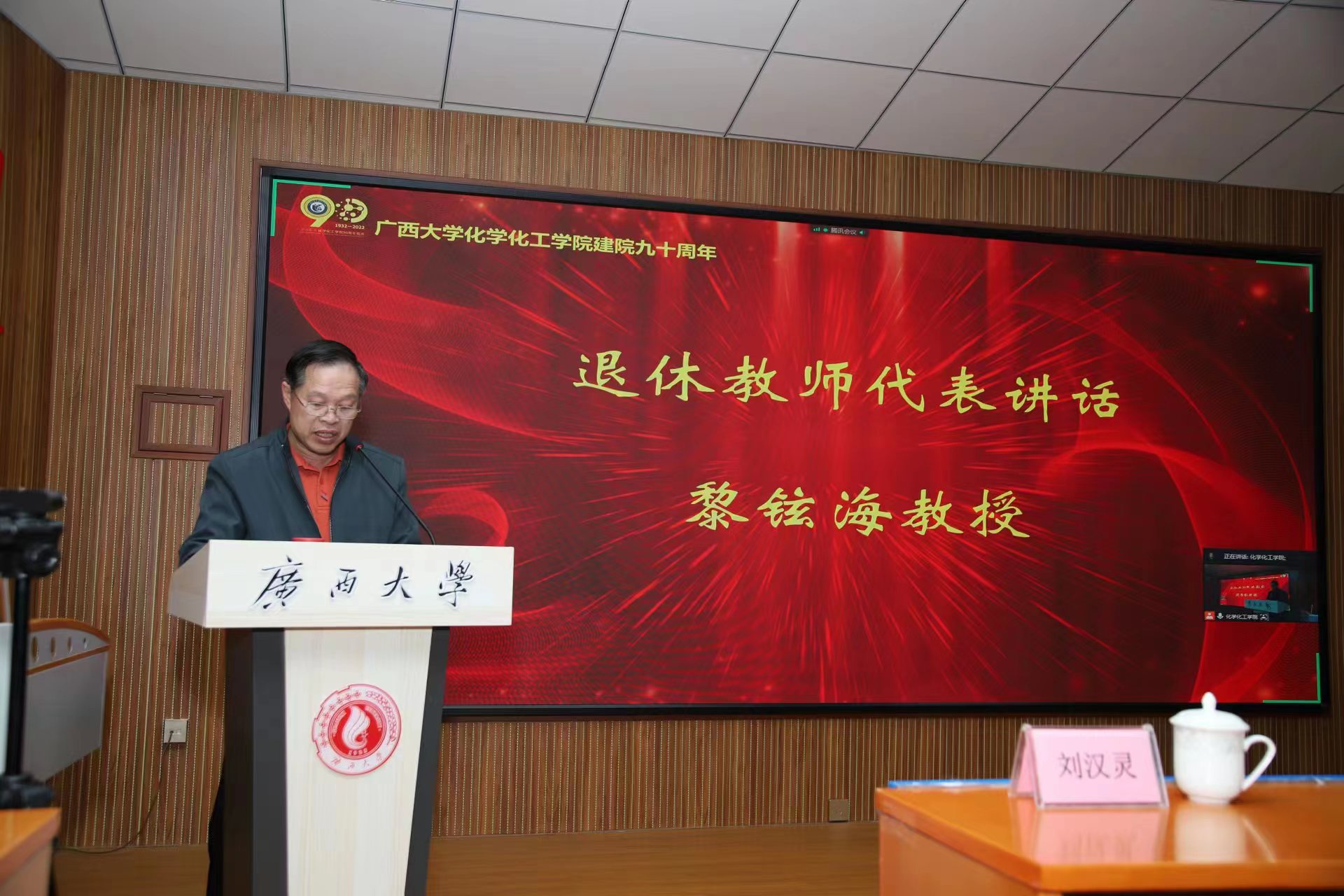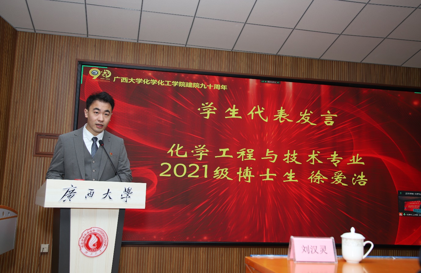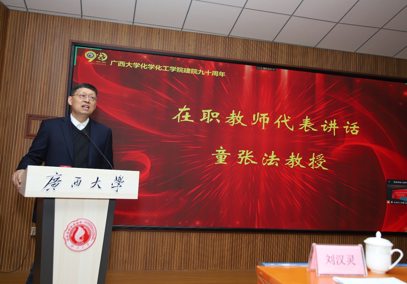 九十载沧桑砥砺,九十载春华秋实!广西大学化学化工学院12月10日下午在化院1号楼举行了隆重而简朴的建院90周年庆祝大会。会议以线下+线上形式同步举行,线下主会场有学院校友、院友、师生代表参会,同时设立了9个分会场,分别为学院柳州、南宁、桂林、梧州/贺州、百色、广东、钦州/北海/防城港、河池、京津冀校友分会会场,同步视频连线共庆学院九秩华诞。会议由化学化工学院党委书记、院长周立亚教授主持。