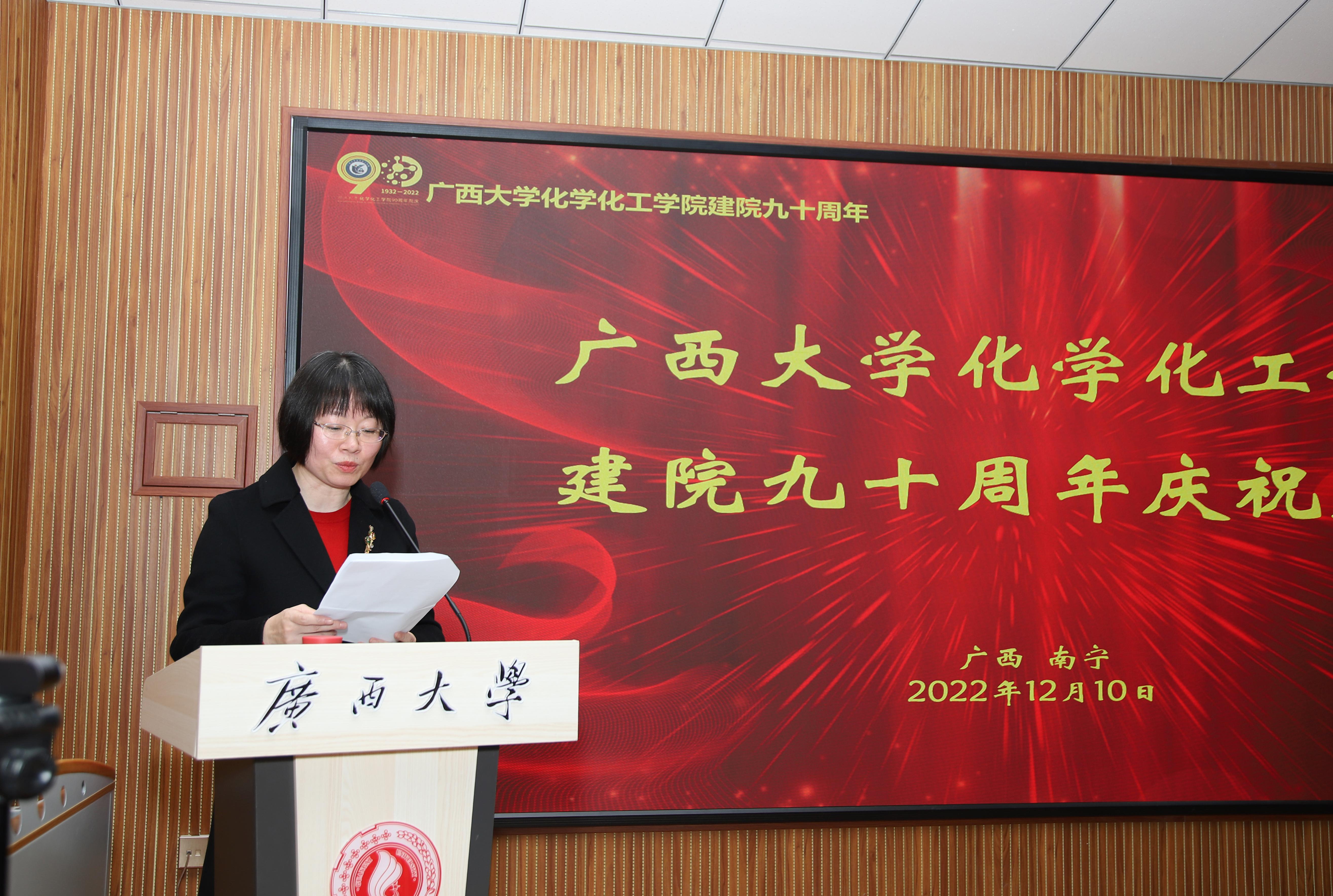 庆祝大会在嘹亮的广西大学校歌歌声中拉开帷幕。首先,广西大学校党委查丹明副书记致欢迎词,她对化院在90周年发展历程中学科建设、科教融合、人才培养、社会服务等方面取得了突出的成绩予以充分肯定,并对学院迈进全面一流提出了新的希望和要求。