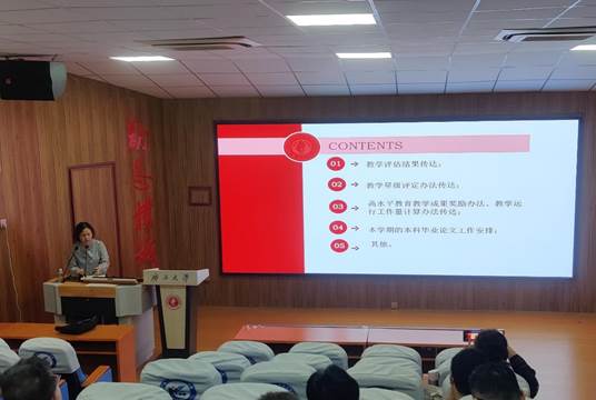 应化系主任许雪棠传达了我校本科教学审核评估的情况,同时还对学校教学运行类、教学建设类工作量的计算办法,以及高水平教学成果奖励办法的修订和征求意见情况进行了简要介绍。