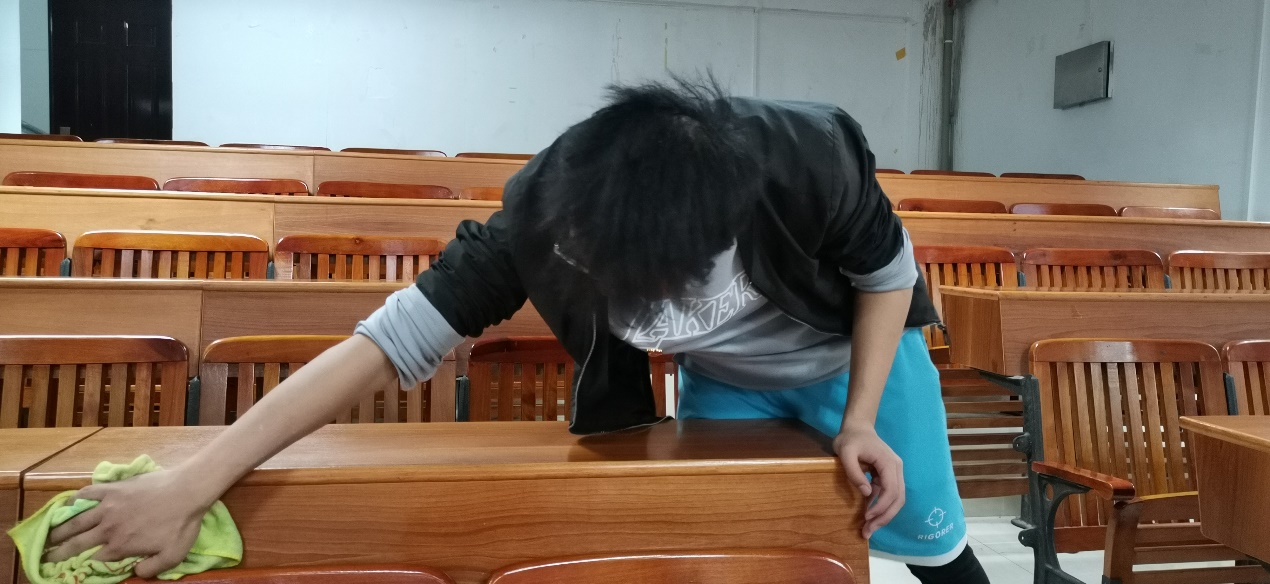 党员同志正在擦拭教室桌面和桌兜