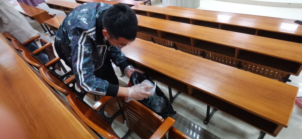 党员与积极分子互相协作,有序对教室地面的残余垃圾进行打扫
