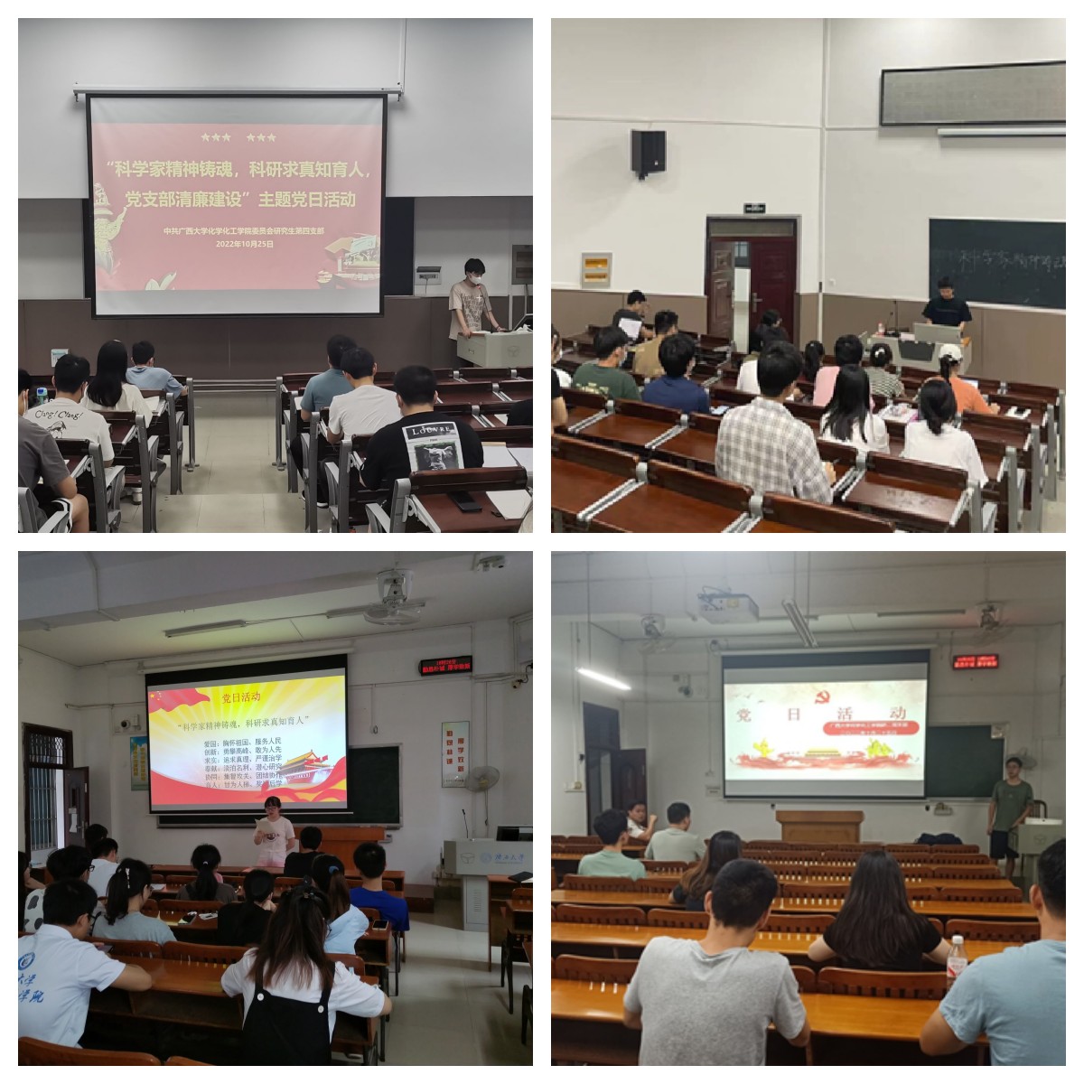为扎实推进清廉学院建设,学院于2022102227日开展“科学家精神铸魂,科研求真知育人”清廉党支部主题党日活动,将科学家精神与党支部清廉文化与有机融合,积极营造崇尚廉洁、科研求真的良好氛围。各党支部结合实际工作,以讲课、主题发言、学习文件、观看纪录片、讲故事、分享心得体会的形式开展主题党日活动。